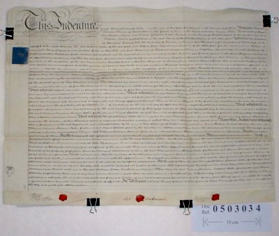 | Parchment : 1 sheet 53cm x 69cm with 3 wax seals and escutcheoned revue stamp. | ||||||||||||