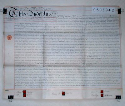 | Parchment : 1 sheet 60cm x 71cm with 5 red wax seals, signatures and revenue stamp. | ||||||||||||