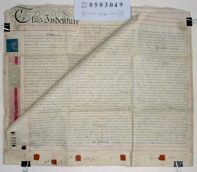 | Parchment : 2 sheets 59cm x 69cm with 5 wax seals and revenue stamps. A second indenture of 1832 completely fills the back of one sheet and has a further 6 wax seals. | |||||||||||