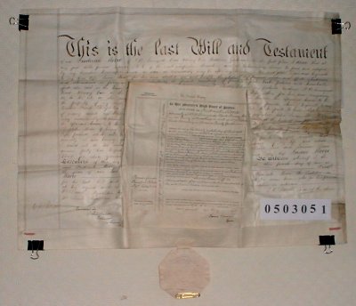 | Parchment : 1 sheet copy Will 65cm x 50cm with pendant seal and 1 sheet Grant of Probate 24cm x 33cm. | ||||||||||||