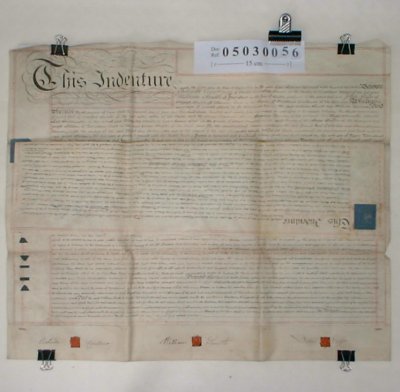 | Parchment : 2 sheets 75cm x 58cm 2 sheets with 9 wax seals, revenue stamps and signatures. A second Indenture of 1824 is written on the back of the second sheet. | |||||||||||