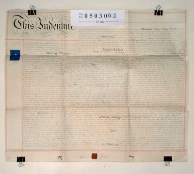 | Parchment : 72cm x 60cm 1 sheet with 1 red wax seal, signature and revenue stamp. | ||||||||||||