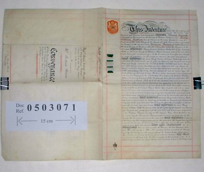 | Parchment : 2 sheets 40cm x 26cm with 3 wax seals and revenue stamp. | |||||||||||