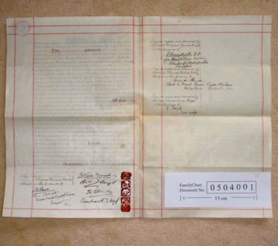 | Parchment : 2 sheets 40cm x 26cm with 5 wax seals and revenue stamps. | |||||||||||