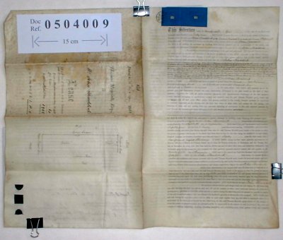 | Parchment : 2 sheets 45cm x 28cm with 2 wax seals and revenue stamps. Includes small plan of property on the cover. This is a printed document with manuscript insertions. | ||||||||||||