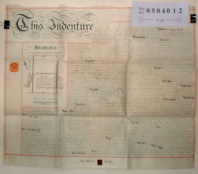 | Parchment : 1 sheet 60cm x 71cm with wax seal, revenue stamp and plan of the property. | |||||||||||