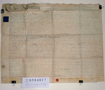 | Parchment : 1 sheet 65cm x 82cm with 1 wax seal and escutcheon revenue stamp. | ||||||||||||