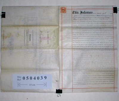 | Parchment : 2 sheets 47cm x 31cm with large plan of the property and revenue stamps. Note that this is a printed document with a few manuscript insertions. | ||||||||||||