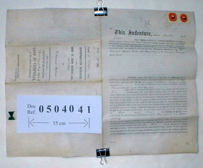 | Parchment : 2 sheets 37cm x 24cm with wax seal and revenue stamp. This is a printed document with manuscript insertions and hand drawn plan of the property. | |||||||||||