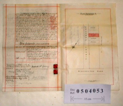 | Parchment : 2 sheets 40cm x 27cm with 2 wax seals, revenue stamps and plan of the property. Accompanying photo shows the inside pages of the document with the plan on the right. | |||||||||||