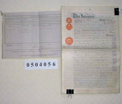 | Parchment : 2 pages 26cm x 40cm with 5 wax seals and signatures. Revenue stamps. Attached Notice 32m x 20cm (copy). | |||||||||||