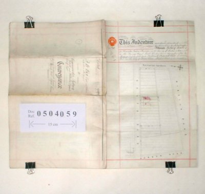 | Parchment : 4 sheets 47cm x 31cm (written on 6 sides) with 5 wax seals and revenue stamps. Includes a large plan of the property on the first page. | ||||||||||||||