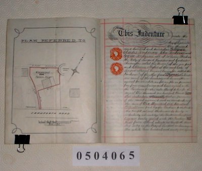 | Parchment : 3 sheets 22cm x 28cm with 3 wax seals and revenue stamps. Plan of the property inside front cover. | ||||||||||||