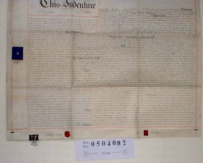 | Parchment : 1 sheet 56cm x 69cm with 2 wax seals and revenue stamp. | ||||||||||||