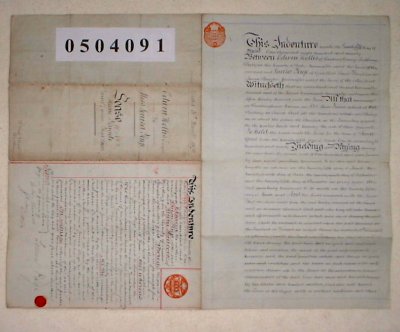 | Paper : 2 sheets 38cm x 24cm signed, sealed and stamped. A second indenture of 1896 has been added on the back cover.