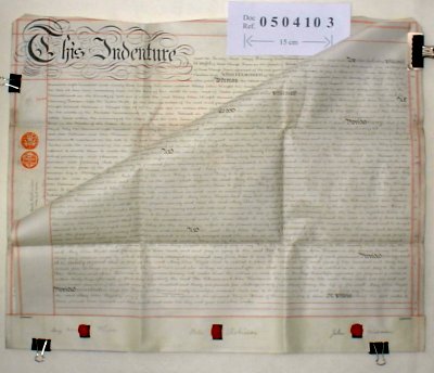 | Parchment : 2 sheets, 57cm x 71cm, with 3 wax seals and revenue stamps | |||||||||||||