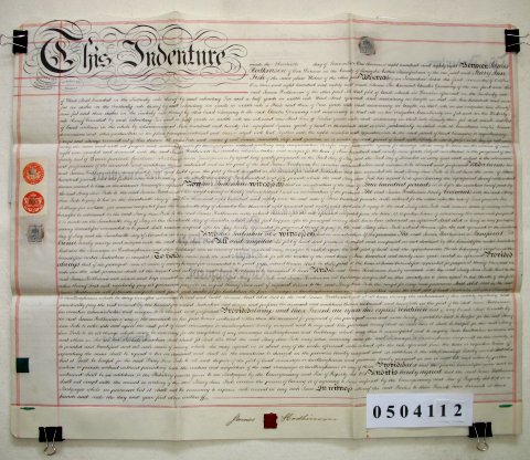 | Parchment : 1 sheet 72cm x 60cm, wax seal and revenue stamp. Two later indentures, both 1889, have been added on back. 2nd Indenture signed sealed and stamped - reassignment 22/3/1889. 3rd Indenture wax seal, signature and with revenue stamp. | ||||||||||||