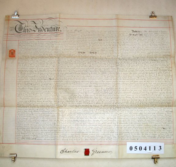 | Parchment : 1 sheet 72cm x 58cm with 1 red wax seal and the flamboyant signature of Charles Greenway. Revenue stamp. | ||||||||||||