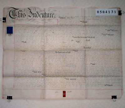 | Parchment : 1 sheet 78cm x 58cm 2 wax seals and revenue stamps. | |||||||||||||