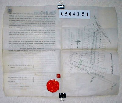 | Parchment : 2 sheets 27cm x 42cm with revenue stamp, wax seal and signature of Frederick Parker. Includes detailed plan on the property. Printed document with manuscript insertions. | ||||||||||||