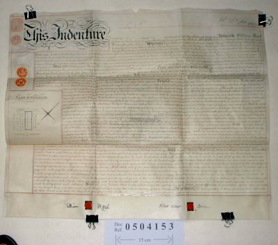 | Parchment : 1 sheet 58cm x 72cm with 2 wax seals, duty stamps and small plan in the margin | ||||||||||||