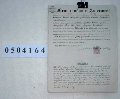 Frank Sharples of Berkely Prenton, Birkenhead, Cheshire. Gentleman William Watkin Davies of 38 Hampstead Road, Elm Park, Liverpool, Lancashire. Merchant Subject Memorandum of agreement for the sale of property in Prenton, Birkenhead. The summary and description of this document are being processed and will appear as soon as possible. If you wish to know details in the meantime, please contact familychest@aol.com by email and we will respond by return. | ||||||||||||