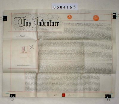 | Parchment : 1 sheet 65cm x 55cm with wax seal, signature and revenue stamps. Contains scaled plan of property. A printed document with manuscript inserts. | ||||||||||||