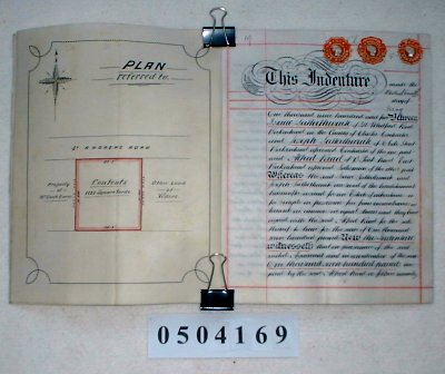 | Parchment : 6 sheets + cover and plan of property. 23cm x 28cm, 3 signatures and seals. Includes outline plan of the property. | |||||||||||