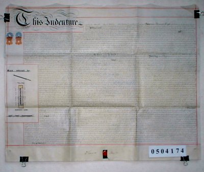 | Parchment : 1 sheet 75cm x 60cm with 1 wax seal and revenue tamps. Plan of property in margin. | ||||||||||||