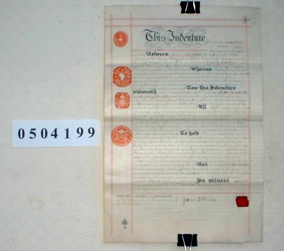 | Parchment : 2 sheets 26cm x 40cm (written on first sheet only) with 1 wax seal, signature and revenue stamps. | ||||||||||||