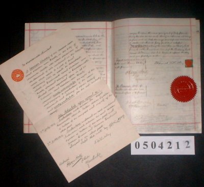| Parchment : 6 sheets 21cm x 27cm wax seal, signed with revenue stamps. Includes full page plan of property and Memorandum. A second document relating to the same parties is included. | ||||||||||||