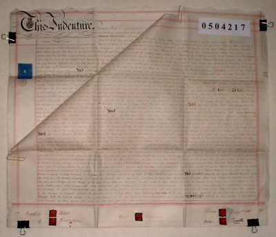 | Parchment : 2 sheets 72cm x 60cm 5 wax seals and signatures with revenue stamps. | |||||||||||||