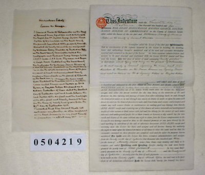 | Paper : 2 sheets 28cm x 34cm on paper watermarked W King Alton Mill. A printed document with manuscript inserts. Signed, sealed and stamped. There is a scaled plan of the property attached, and 2 handwritten letters, signed and dated. | |||||||||||