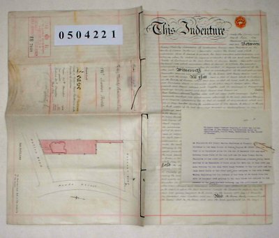 | Parchment : 3 sheets 30cm x 47cm with 1 wax seal, revenue stamp, and plan of the property on the cover. A carbon copy of a typed letter of 1918 is also attached. | ||||||||||||