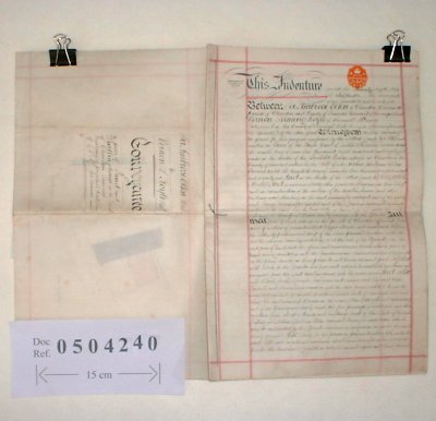 | Parchment : 30cm x 40cm 5 sheets, 2 wax seals and signatures, revenue stamp, plus plan of property on back page. | ||||||||||||