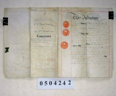 | Parchment : 2 sheets 22cm x 26cm with wax seal and revenue stamps. Small plan at bottom of second sheet. | |||||||||||