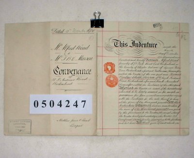 Alfred READ formerly of 73 Park Road, Birkenhead, Cheshire, but now of Lynmore, Palm Grove, Birkenhead, Cheshire. Gentleman. Thomas Benbow Child MARSON of 31 Saint Andrews Road, Birkenhead, Cheshire. Bank Accountant. SUBJECT Conveyance of 31 St Andrews Road, Birkenhead. This document has not been written up yet. Please contact FamilyChest for details. | |||||||||||