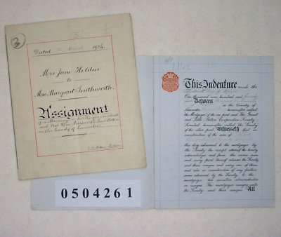 Jane HOLDEN of 92 Church Street, Little Lever, Lancashire. Widow Margaret SOUTHWORTH the wife of Thomas SOUTHWORTH of 91 Hall Lane, Moses Lane, near Bolton, Lancashire, Oil Refiner. NOTE : The document being sold here at the price of £25.00 is ONLY that on the left of the photograph. (That shown on the right is Doc.Ref. 0504262) SUBJECT The document concerns property at number 85 Ainsworth Lane, Bolton, Lancashire on which a 999 year lease was created in 1899. Jane Holden is now selling the residue of the lease to Margaret Southwark for £320. | ||||||||||||