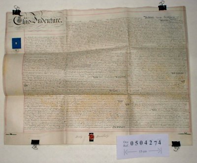 | Parchment : 1 sheet 59cm x 76cm with 1 wax seal and revenue stamp. | |||||||||||||||