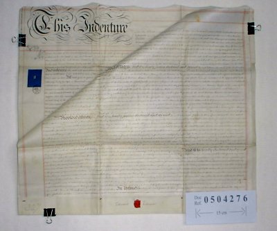 | Parchment : 2 sheets 54cm x 69cm with 1 wax seal and revenue stamps, | |||||||||||