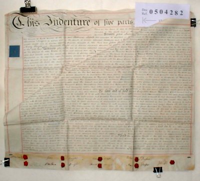 | Parchment : 2 sheets 61cm x 72cm with 9 wax seals and revenue stamps | |||||||||||||