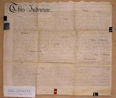 | Parchment : 1 sheet 60cm x 70cm with 2 wax seals and revenue stamps.