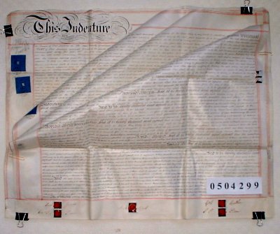 | Parchment : 4 sheets 70cm x 58cm 9 wax seals, signatures and revenue stamps. Includes two later deeds of 1892 and 1900 written on the back of various sheets. | |||||||||||||