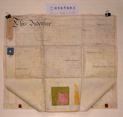 | Parchment : 2 sheets 60cm x 72cm with 6 seals, revenue stamps and a small plan of the property on the reverse. | |||||||||||