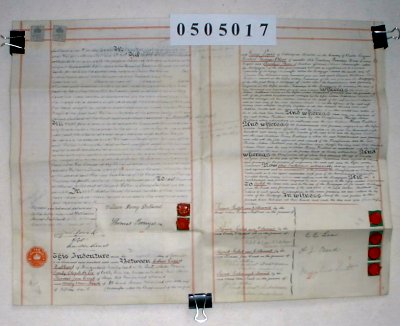 | Parchment : 2 sheets 26cm x 40cm with 6 wax seals and duty stamps. The document includes a Deed of Confirmation of 1909 written on a spare page. | ||||||||||||