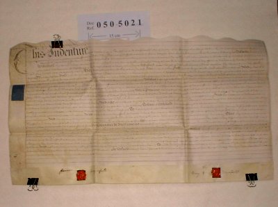 | Parchment : 1 sheet 42cm x 74cm with 2 wax seals and revenue stamps. | |||||||||||||