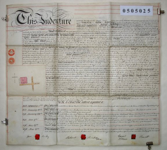| Parchment : 1 sheet 64cm x 70cm with 3 wax seals, revenue stamp and small plan of the property. | ||||||||||||