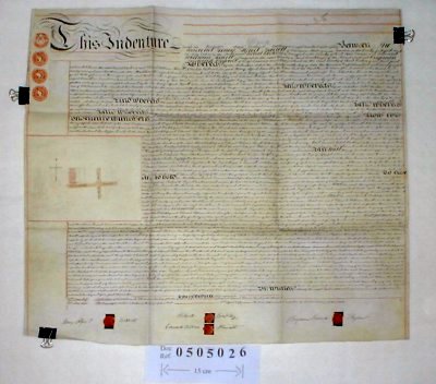 | Parchment : 1 sheet 65cm x 71cm with 4 wax seals, revenue stamps and plan of the property. | |||||||||||
