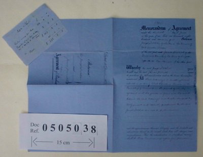 | Paper : 2 sheets 32cm x 20cm. This is an undated copy of the original agreement. A scrap of paper detailing payment is attached. | |||||||||||