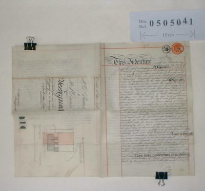 | Parchment : 25cm x 38cm 2 sheets, 2 wax seals, revenue stamp and signatures. There is a plan of the property on the back page. | |||||||||||